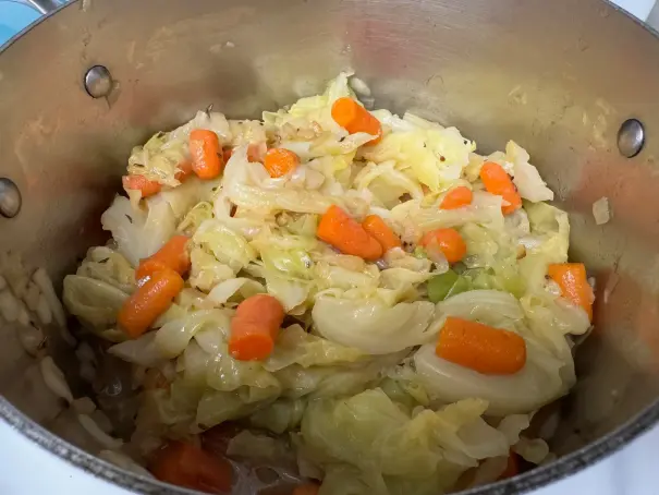 - The dish starts with you cutting a head of cabbage into 2-inch wedges. Remember to remove the hard core first. Cut your baby carrots in half and add all these vegetables to a large pot and cover with water. Bring the water to a boil on the stove and then reduce to low and cook for about 20 minutes until the carrots are tender. Drain the veggies well in a colander to get rid of extra water.
