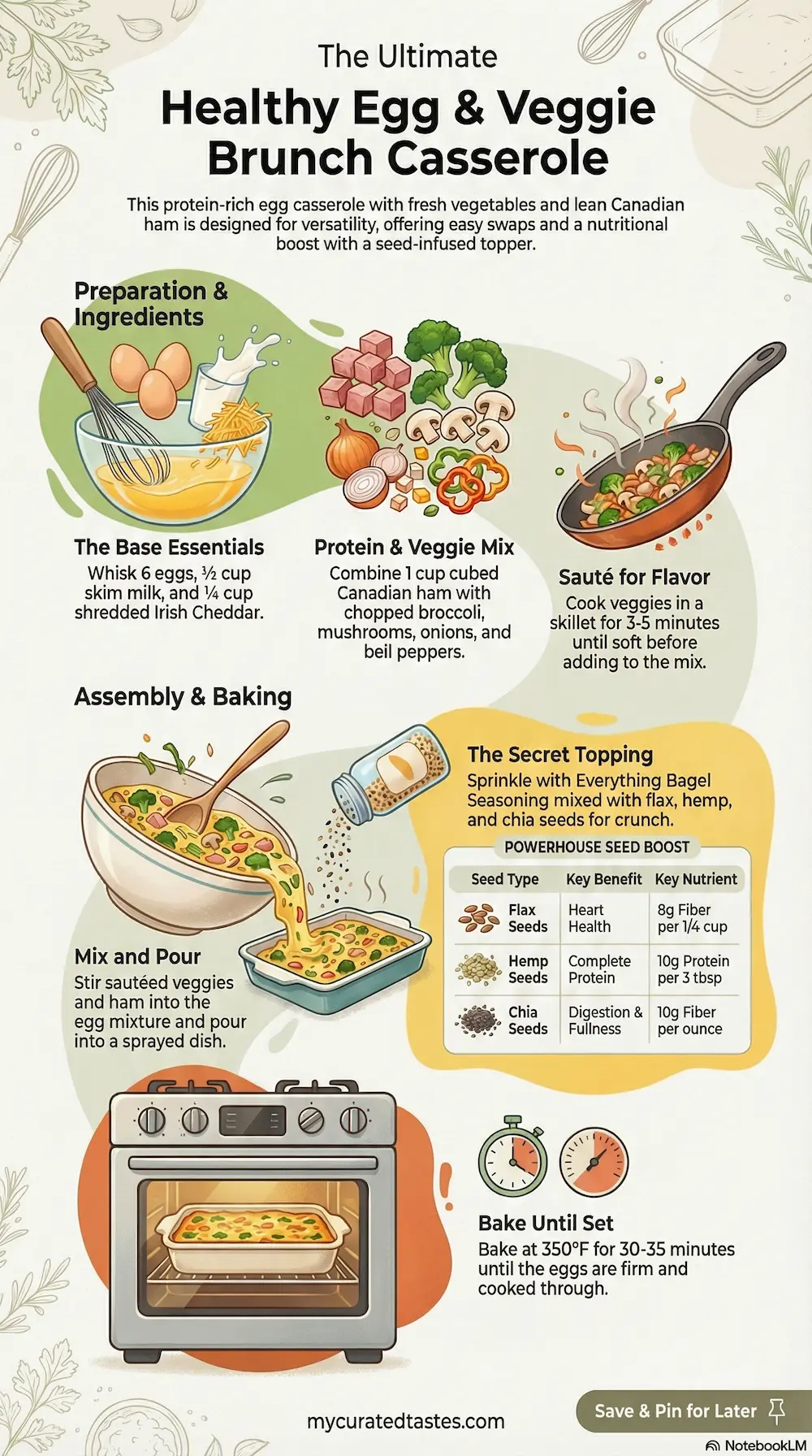 This version is quite nutritious. It’s high in protein from eggs, ham, and cheese, and packed with vegetables. Using 98% fat-free Canadian ham and skim milk keeps the fat content lower than many casseroles. The optional addition of flax, hemp, and chia seeds to the everything bagel seasoning adds fiber, omega-3 fatty acids, and plant-based protein with virtually no change to the flavor.