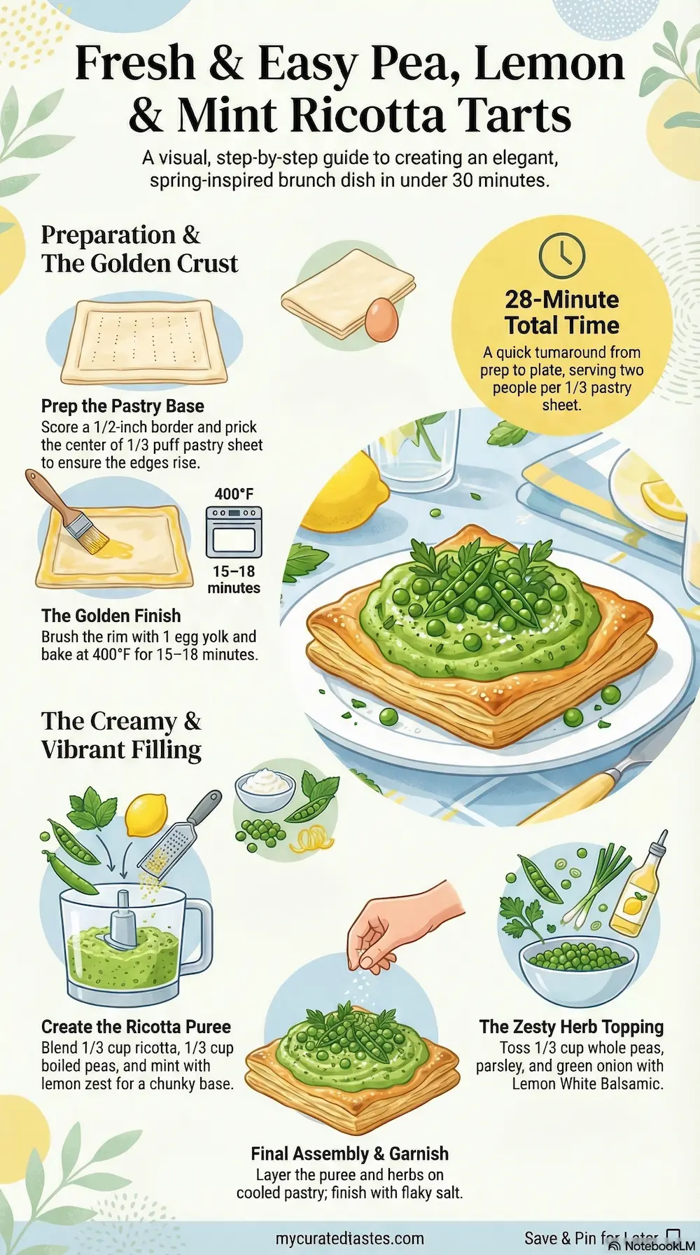 You can prepare the components ahead of time, but assemble them only just before serving. Bake the puff pastry shells, prepare the ricotta mixture, and make the herb and pea topping — then store each separately until you’re ready to serve. Once assembled, the tarts should be eaten right away, as the pastry will soften and lose its satisfying crunch fairly quickly. The pastry shells can be re-crisped in a 375°F oven for a few minutes if needed.