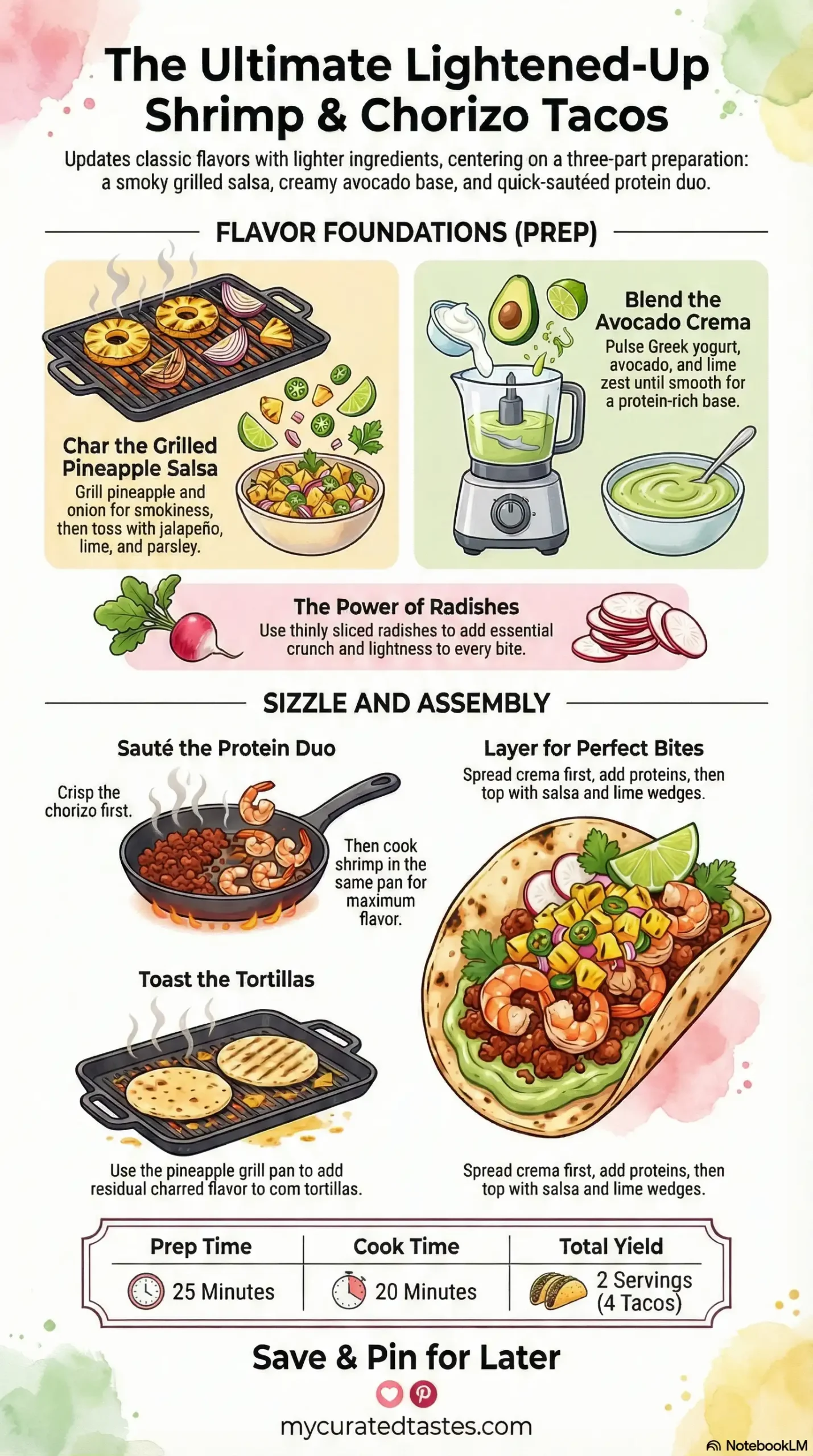 - It is time to assemble the tacos. I spread on some of the avocado crema, then add the shrimp and chorizo mixture. Top with the pineapple salsa and sliced radishes. Serve with lime wedges on the side.