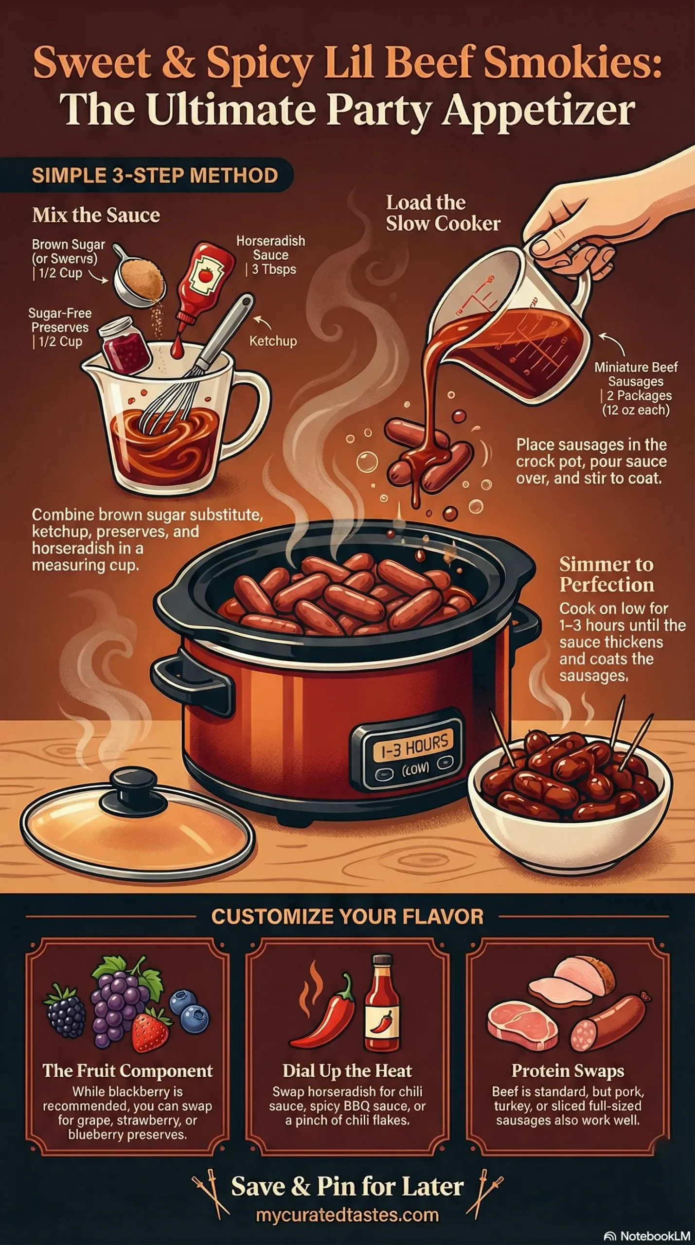 This recipe is a crowd-pleaser for one simple reason: the sauce is doing all the heavy lifting. The combination of a brown sugar substitute, ketchup, fruit preserves, and prepared horseradish creates a perfectly balanced glaze — sweet enough to satisfy, with just enough heat to keep people reaching for more. Cooking the smokies low and slow in the crock pot lets that sauce thicken up and cling to every sausage, deepening the flavor over time. Because the beef smokies are already precooked, there’s virtually no prep — just dump, stir, and walk away. The recipe is also incredibly flexible: swap the fruit preserves, dial the heat up or down, use any protein you like. It’s the kind of effortlessly reliable appetizer that looks like you put in way more effort than you did, which is exactly why it’s been a party staple for decades.